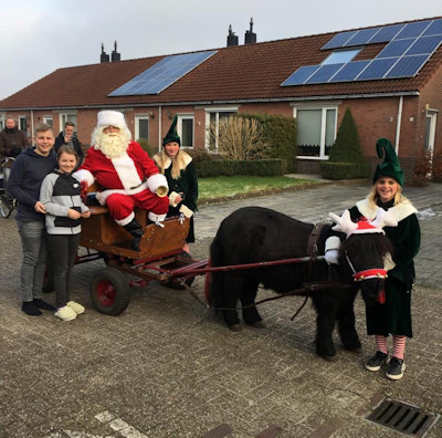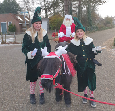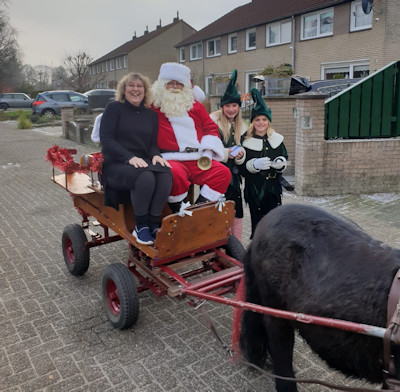De kerstman ging, met twee elfjes, op de ponykar door Boswijk. Scrooge reed er voor aan en riep de bewoners met zijn megafoon